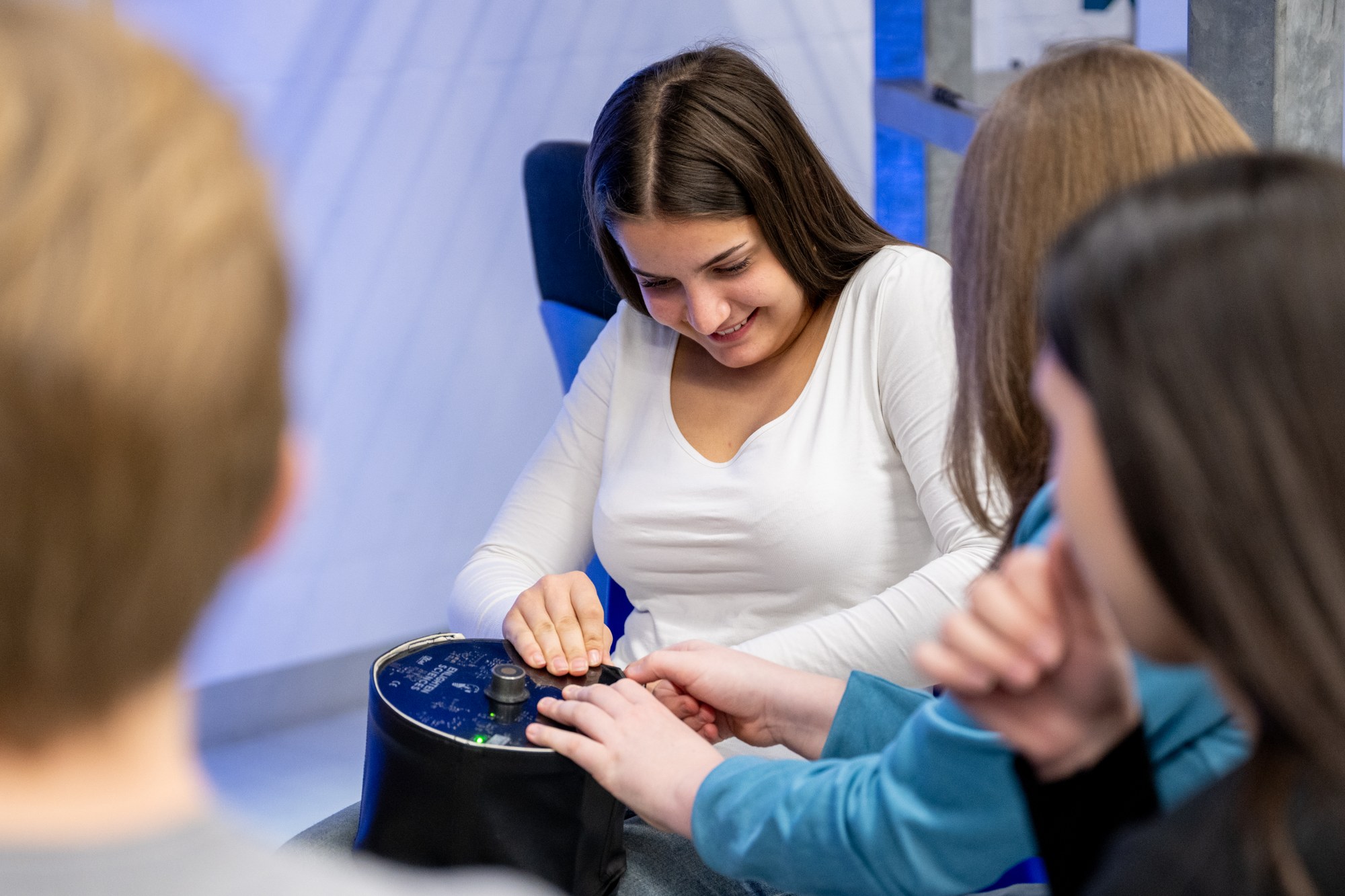 Die Schülerin bereitet die Fallkapsel für den nächsten Abwurf von unserem Mini-Fallturm vor. Experimente in der Schwerelosigkeit.