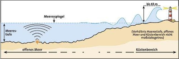 Und warum auch ein relativ flacher Tsunami eine gewaltige, zerstörerische Wucht hat …