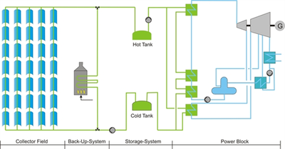 - Während Solarturmkraftwerke bereits mit Flüssigsalz arbeiten, fehlt es bei Parabolrinnenanlagen an großmaßstäblichen Referenzprojekten.