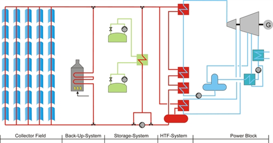 Übliche Parabolrinnenkraftwerke nutzen Thermoöl als Wärmeträgermedium, das auf maximal etwa 400 Grad Celsius erhitzt wird. Die Wärme wird über Wärmetauscher an einen Dampfkraftprozess abgegeben, um Strom zu erzeugen. Überschüssige Wärme kann in Salzspeichern zwischengespeichert und später genutzt werden. Das Problem: Die Prozesstemperatur ist durch das Öl limitiert – das Flüssigsalz ermöglicht in den Speichern weitaus höhere Temperaturen. Zusätzlich wird immer ein Öl-Salz-Wärmetauscher benötigt, um die Wärme an die thermischen Salzspeicher zu übertragen. Dies erhöht die Investitionskosten, die Anlagenkomplexität und reduziert die Gesamteffizienz des Systems.