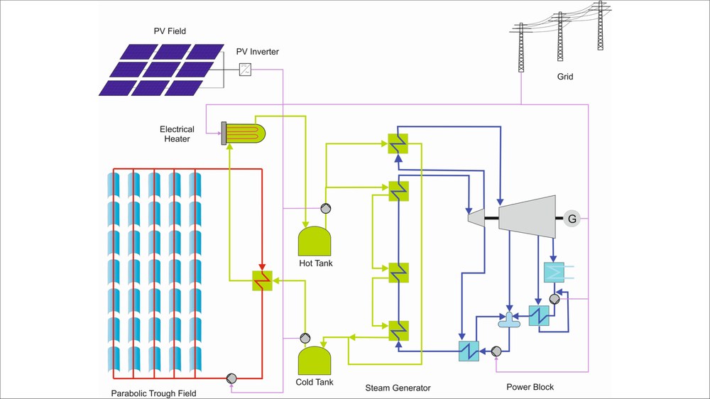 Der Strom kommt dabei tagsüber überwiegend aus der dann kostengünstiger produzierenden PV-Anlage und nachts aus dem Kraftwerksteil der solarthermischen Anlage, die dafür auf gespeicherte Solarwärme zugreift.