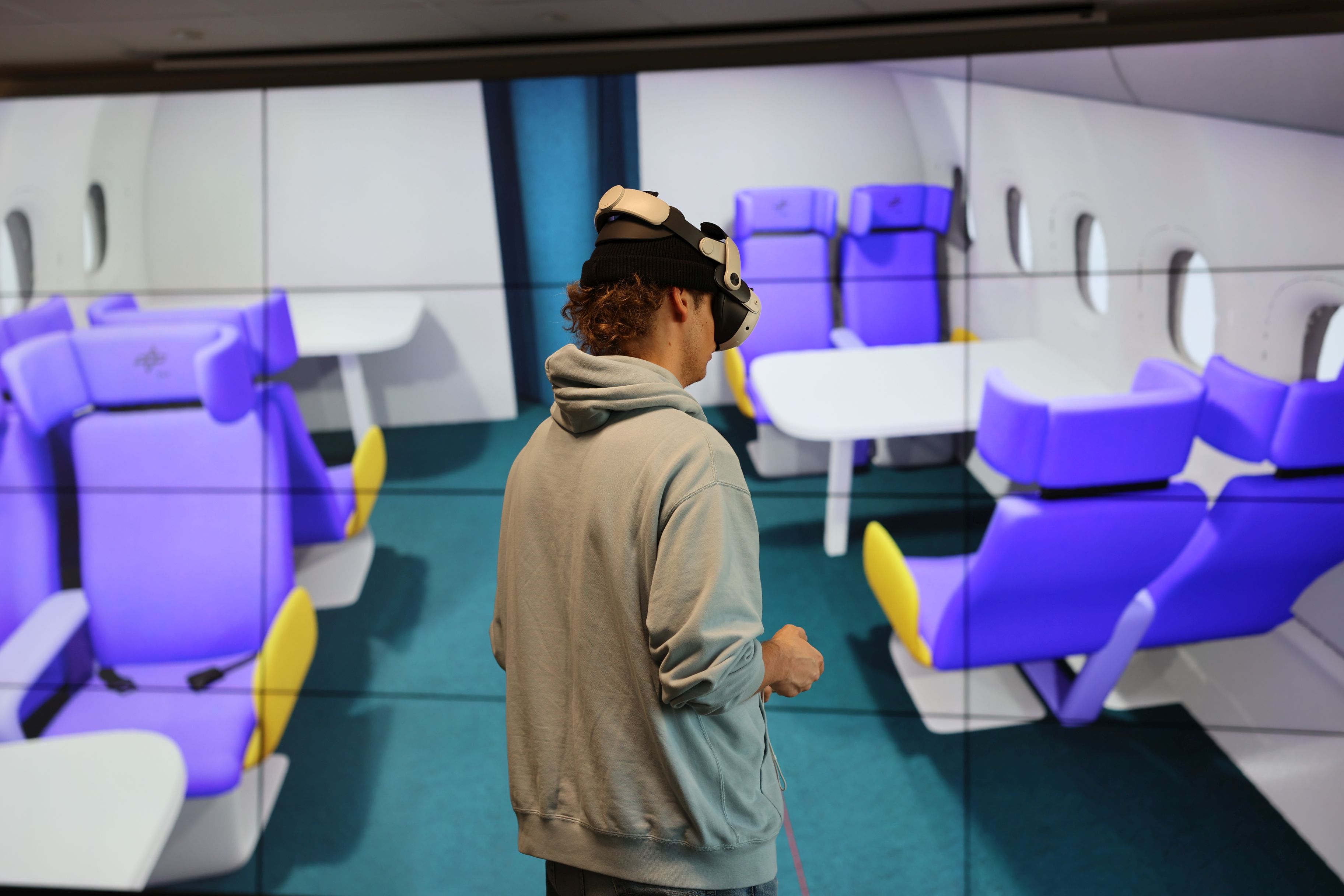 Co-Design in Echtzeit - für nutzerzentrierte Kabinenlösungen. Im immersiven Cabin Lab können Interessierte in den vorderen Bereich einer virtuellen Kabinenumgebung eintauchen, um die am DLR entwickelten nutzerzentrierten und kollaborativen Entwurfsmethodiken hautnah zu erleben.
