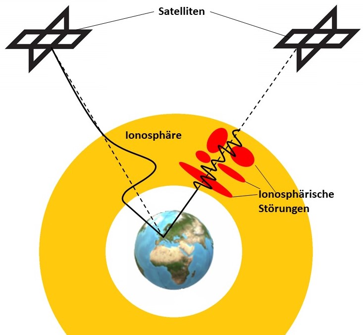 Die Signale der Satelliten werden beim Durchqueren der Ionosphäre beeinflusst: Durch das Plasma der Ionosphäre werden Radiosignale „abgelenkt”. Der entscheidende Faktor ist dabei der Elektronengehalt (TEC, engl. „Total Electron Content“) der Ionosphäre, also die Anzahl an Elektronen entlang des Signalpfads. Weltraumwetter-Ereignisse können den TEC sehr schnell verändern wodurch diese „Ablenkung“ der Signale schwer vorherzusehen und zu korrigieren ist.
