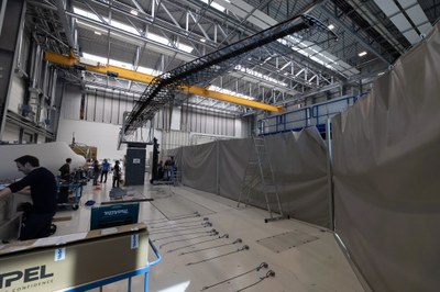 In Vorbereitung auf das Critical Design Review – einen wichtigen Entwicklungsschritt – erfolgt ein statischer Belastungstest des vollständigen Flügels. Ziel ist es, die Auslegung durch praktische Messungen zu überprüfen und die Belastbarkeit der Komponenten nachzuweisen. Dazu hängt der Flügel kopfüber an seinem späteren Anschlusspunkt am Rumpf – exakt so, wie er später im Flugzeug eingebaut sein wird. Individuell platzierte Gewichte an den Rippenpositionen simulieren die Auftriebskräfte, die im Flug wirken. So lässt sich der Querkraftverlauf über die Flügellänge besonders präzise nachbilden.