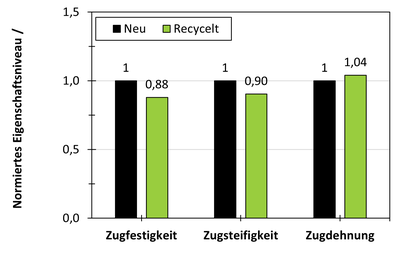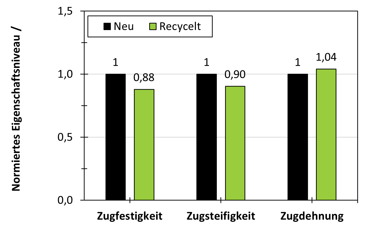 Zugeigenschaften von Prüfkörpern aus neuem und recyceltem Hochleistungsthermoplasten gefüllt mit Kohlenstoff-Kurzschnittfasern.