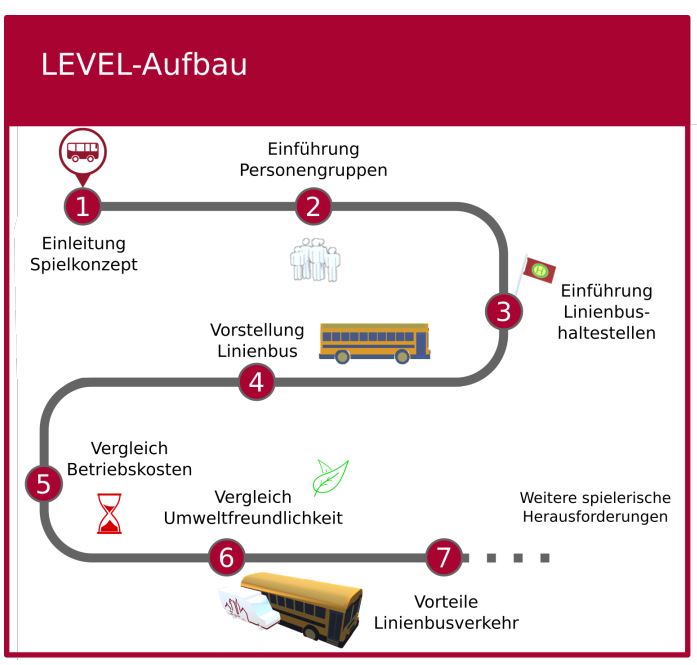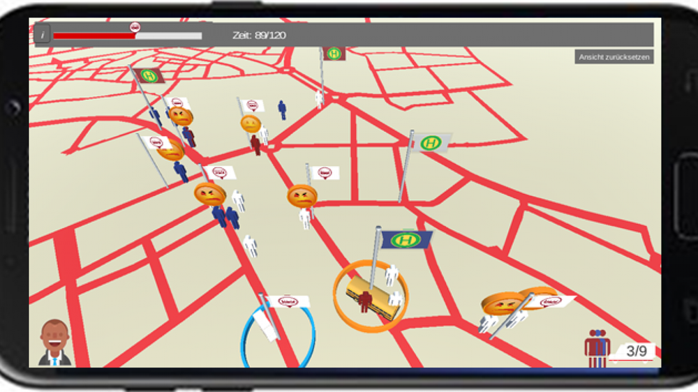 Das digitale Lernspiel, ein sogenanntes Serious Game, das nicht ausschließlich der Unterhaltung dient, wurde im Februar 2019 mit 71 SchülerInnen im Alter von 15 bis 18 Jahren auf Tablets getestet. Die Evaluationsstudie verglich die Ergebnisse zwischen SchülerInnen, die zufällig einer von zwei Gruppen zugeordnet wurden: der Serious-Gaming-Gruppe und der Online-Recherche-Gruppe. Die Aufgabe der Serious-Gaming-Gruppe bestand darin, sich in die Rolle eines Verkehrsplaners zu versetzen und einen Rufbus mit der Kapazität von neun Sitzplätzen in einer virtuellen Stadt zu managen und dem Mobilitätsbedarf der Bevölkerung mit einem bedarfsgesteuerten Angebot gerecht zu werden. Die SchülerInnen der Online-Recherche-Gruppe sammelten währenddessen Informationen zum Rufbuskonzept im Internet.