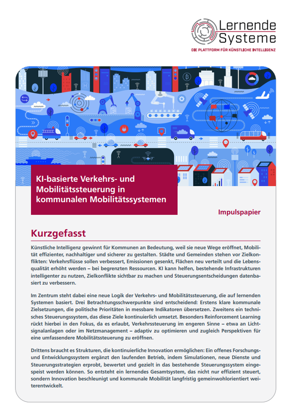 Die Plattform Lernende Systeme hat ein Impulspapier veröffentlicht zum Thema KI-basierte Verkehrs- und Mobilitätssteuerung in kommunalen Mobilitätssystemen.