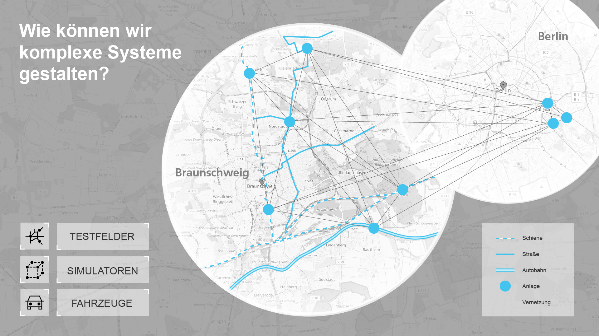 Die Forschungsanlagen und Labore des Instituts für Verkehrssystemtechnik greifen ineinander wie Teile eines Baukastens. Die Möglichkeit zur flexiblen Kombination der einzelnen Bausteine ist ein wesentliches Merkmal unseres Anlagenportfolios. Beispielsweise können verschiedene Simulationsmodelle für Probandenstudien kombiniert werden. Damit können kritische Situationen im Verkehrsablauf – an Kreuzungen und Bahnübergängen – bereits frühzeitig in der Entwicklung zukünftiger Assistenzsysteme berücksichtigt werden. Darüber hinaus lassen sich die Bausteine zu einem vollständigen Arbeitsfluss kombinieren. Die Forschungsanlagen ermöglichen eine bruchlose Verknüpfung empirischer Datenerhebungen und Simulationsuntersuchungen bis hin zu einer schrittweisen Überführung wissenschaftlicher Erkenntnisse in die Realität.