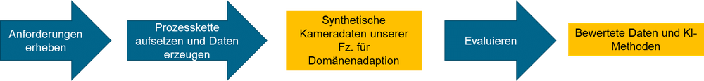 Die Erhebung umfangreicher Realdaten spielt eine wesentliche Rolle bei der Entwicklung von KI-Systemen und ist oft mit einem hohen zeitlichen und finanziellen und damit nicht mehr ökonomisch vertretbarem Aufwand verbunden. Aus diesem Grund besteht der dringende Bedarf die für das Training einer KI erforderlichen Daten synthetisch zu erzeugen. Dabei bestehen allerdings noch diverse Herausforderungen, wie z.B. die Unausgeglichenheit und Redundanz der Trainingsdaten. So darf beispielsweise das seltene Auftreten bestimmter kritischer Ereignisse (z.B. Beinaheunfall) nicht zu falschem Systemverhalten führen. Eine zur Datengenerierung häufig benutzte Technik ist dabei die Domänenanpassung, mit der bestehende Daten einer Quelldomäne (z.B. Weg- und Hinderniserkennung) auf eine bestimmte Zieldomäne (z.B. Weg- und Hinderniserkennung bei schlechtem Wetter) adaptiert werden ohne diese Daten erneut annotieren zu müssen. Daher besteht das Ziel des Projektes darin eine Werkzeugkette zu entwickeln, mit der realistische Kameradaten für Anwendungen im automatisierten Straßenverkehr und in der Robotik synthetisch erzeugt werden sowie diese anzuwenden und zu demonstrieren.