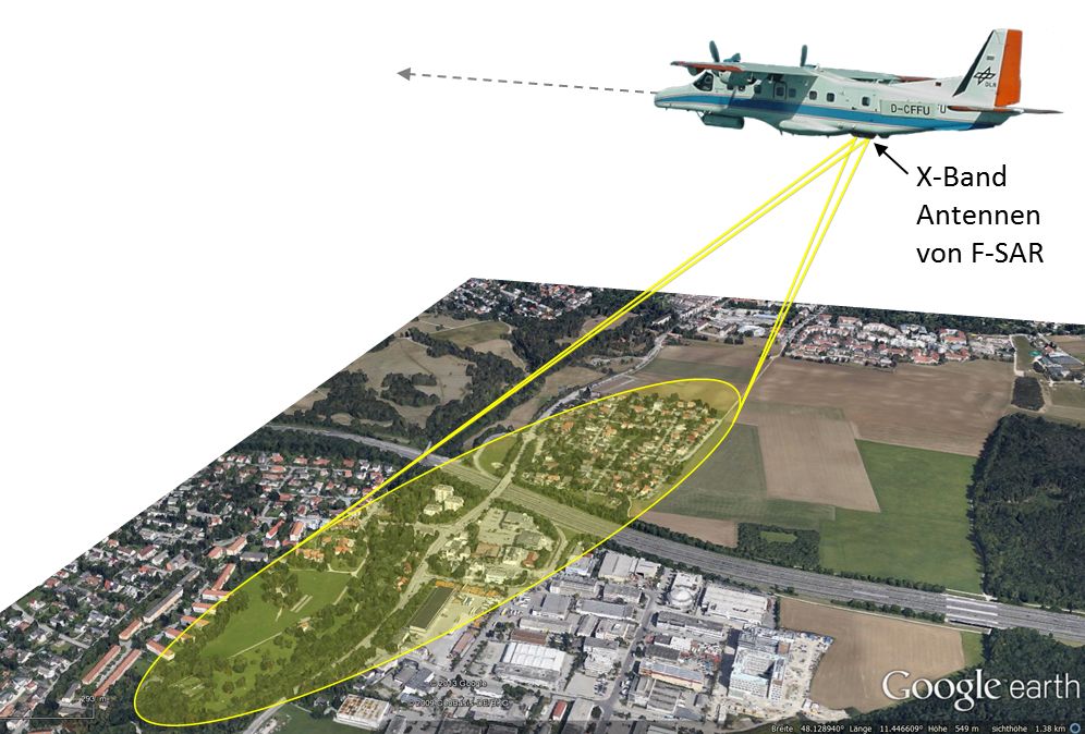 Die Verwendung eines bildgebenden Radars im Flugzeug ermöglicht die großflächige Erfassung des aktuellen Straßenverkehrs und der dazugehörigen Infrastruktur unabhängig vom Wetter, von Wolken und Lichtverhältnissen. Für VABENE++ steht hierfür das F-SAR Radarsystem auf dem Forschungsflugzeug Do 228-212 zur Verfügung. An Bord befindet sich ein leistungsstarker Radar-Prozessor, der aus den erfassten Radardaten in nahe-Echtzeit Verkehrsinformationen extrahiert und hochauflösende Radarbilder generiert, aus denen beispielsweise die zeitlich veränderliche Parkplatzbelegung abgelesen werden kann. Über eine Funk-Datenverbindung werden die Verkehrsinformationen und Daten zum Boden übertragen.