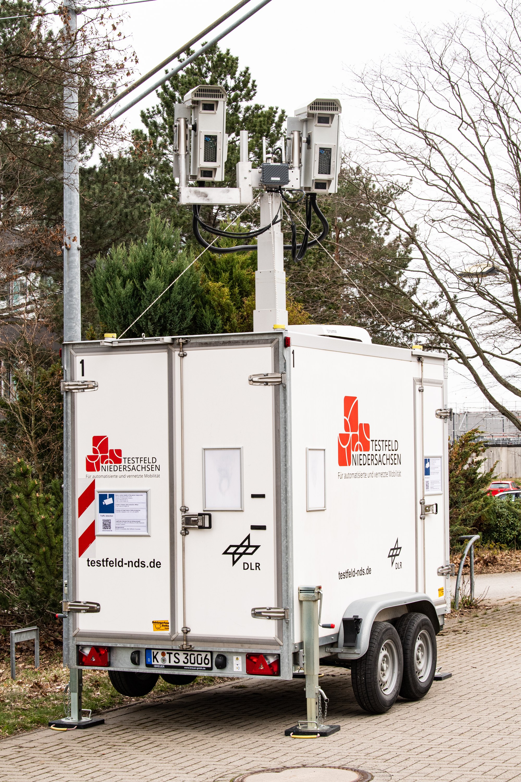 Der mobile Mast ist eine bewegliche Mess- und Kommunikationseinheit, die flexibel im Straßenraum eingesetzt werden kann. Er gehört zum Testfeld Niedersachsen und wird in verschiedenen Forschungsprojekten eingesetzt.