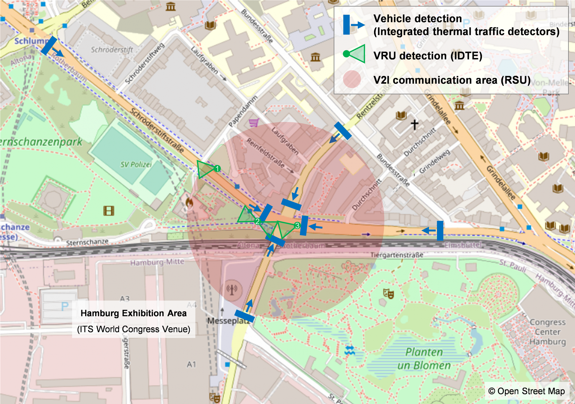 Technical setup of additional detection and communication equipment at the test intersection.