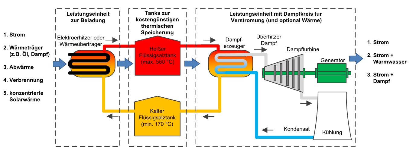 Funktionsprinzip von Flüssigsalzspeichern mit möglichen Quellen und Senken