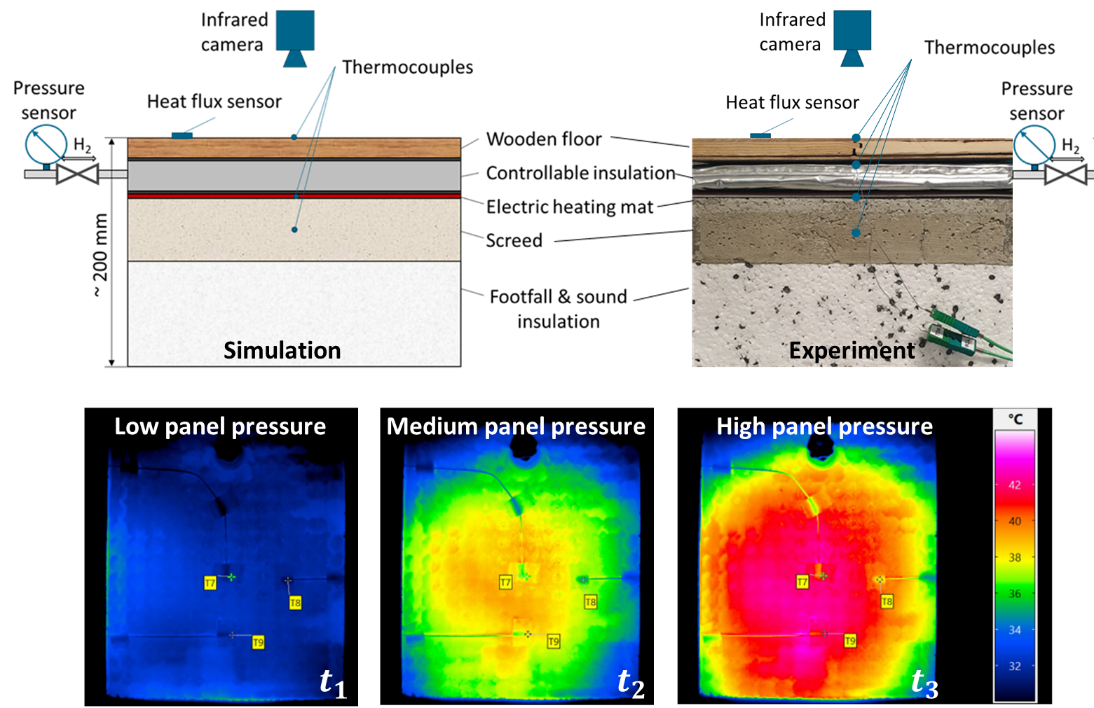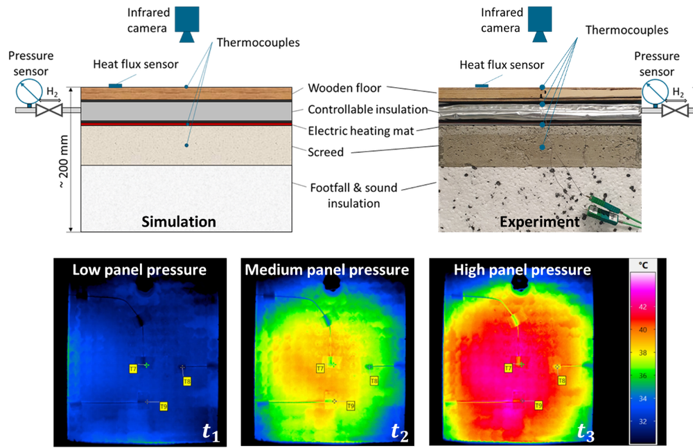 - Darüber hinaus erlaubt die Anwendung regelbarer Dämmpaneele innerhalb des Gebäudes die gezielte Aktivierung bestehender, massiver Gebäudeteile als thermische Energiespeicher. Insbesondere in Bestandsgebäuden gestaltet sich die Dekarbonisierung des Heizenergiebedarfs im Winter schwierig. Beispielsweise Wand-, Boden-, oder Deckenaufbauten werden zu modularen Bausteinen eines Heizsystems verwandelt, indem die massereichen Strukturen bspw. mittels Klebematten elektrisch beladen werden und die Wärmeabgabe in den Raum bedarfsgerecht mithilfe der adaptiven Dämmung eingestellt wird. Durch die Nutzbarmachung bereits bestehender Kapazitäten kann die Bauteilaktivierung ressourcenschonend zur Flexibilisierung des Energiesystems beitragen.