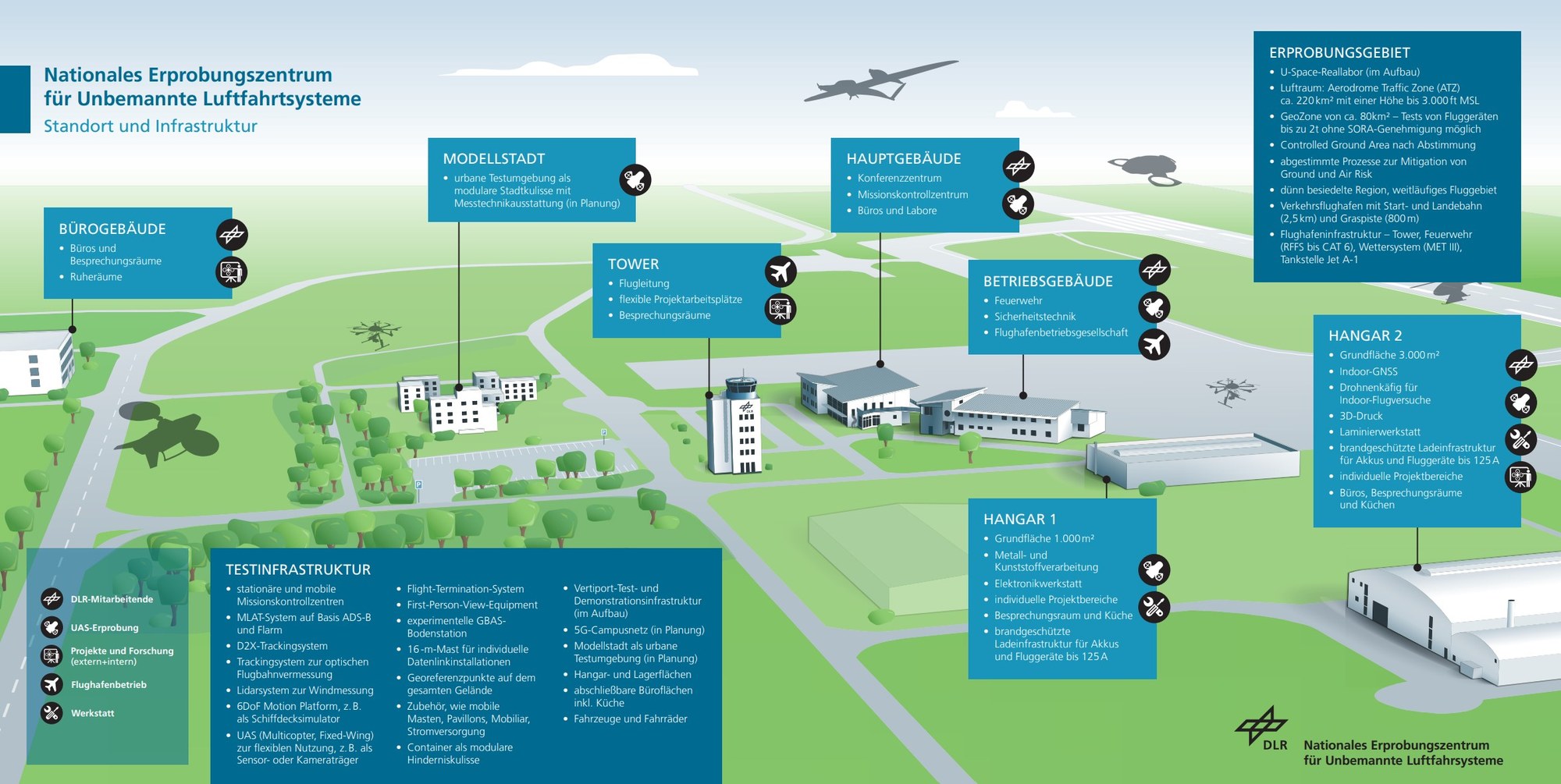 Um umfangreiche Testszenarien durchzuführen, bietet das Erprobungszentrum eine vielfältige bauliche und technische Infrastruktur. Zur Verfügung stehen die Runway (Länge: 2,5 Kilometer) und eine Graspiste (Länge: 800 Meter) für unterschiedliche Tests. Auf einem runden und einem quadratischen Vertipad (Start- und Landeplätze für vertikal startende UAS) können Starts und Landungen erprobt werden.