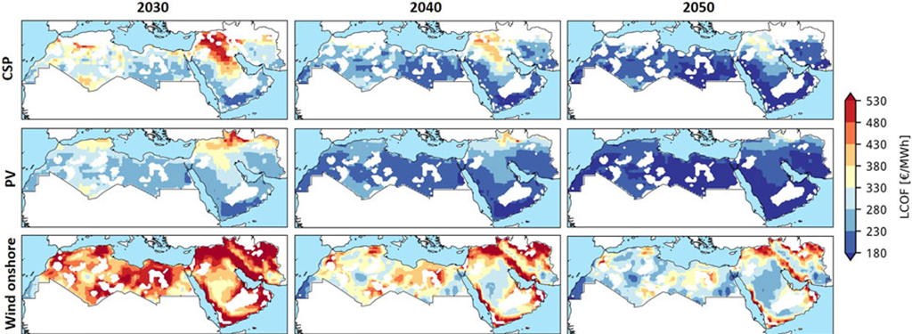 Die Studienergebnisse verdeutlichen, dass die Kosten für die Produktion synthetischer Kraftstoffe in der betrachteten MENA-Region zwischen den Jahren 2030 (linke Spalte) und 2050 (rechte Spalte) kontinuierlich abnehmen. Der Blick auf die untersuchten Stromerzeugungstechnologien belegt zudem: Die Kraftstoffproduktion mit Strom aus Solarenergien (CSP und PV; obere und mittlere Spalte) weist über den gesamten untersuchten Zeitraum niedrigere Kosten auf, als dies bei der Brennstoffproduktion mit Strom aus Onshore-Windenergie (untere Spalte) der Fall sein würde.