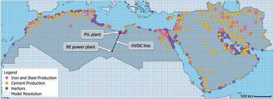 Die verschiedenen Komponenten des Power-to-Liquid- (PtL-)Prozesses können unterschiedliche Standorte haben und erfordern daher unterschiedliche Transportwege für elektrische Energie und Rohstoffe. So bietet die Wasserelektrolyse in Hafennähe den Vorteil, dass H2O aus nahe gelegenen Meerwasserentsalzungsanlagen bezogen werden kann, wodurch der Transport von Wasser durch die Wüste entfällt. In der Modellierung wurde folglich davon ausgegangen, dass die PtL-Anlage – einschließlich Elektrolyse, Wasserstoffspeicherung und Fischer-Tropsch-Synthese – in der Nähe des nächstgelegenen Hafens liegt, um die Transportwege für den möglichen Export der produzierten Kraftstoffe zu minimieren. Auch Eisen- und Stahlwerke sowie Zementwerke befinden sich in der Regel in Küstennähe, was wiederum die Transportwege für CO2 verkürzt.
