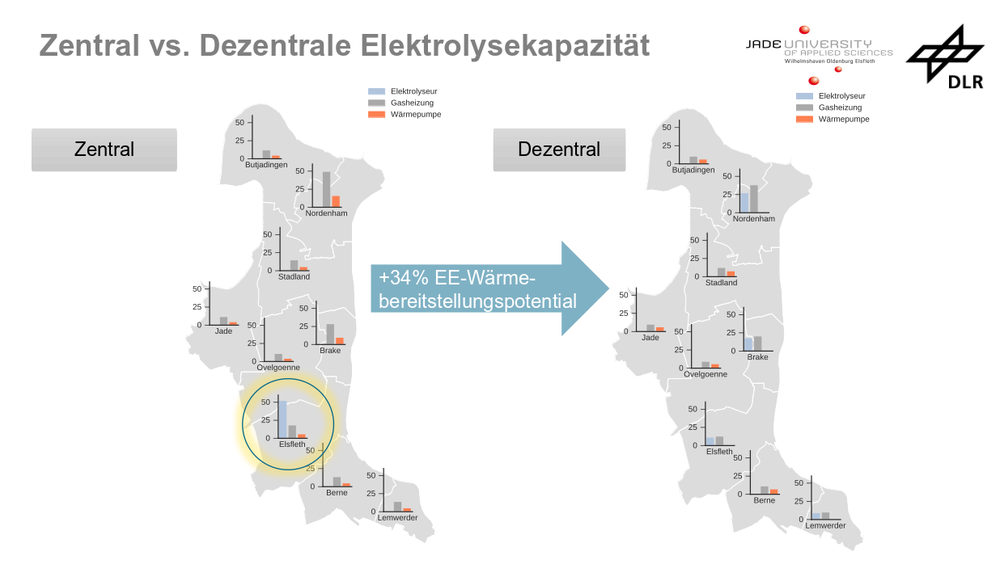 Die große Praxisnähe des ReStEP-Tools hatte sich bereits während der Projektphase vor Ort herausgestellt. So lassen sich mögliche Entscheidungen zur kommunalen Energieplanung per „Was-wäre-wenn“-Analyse mit überregionalen Szenarien abgleichen, zum Beispiel in Bezug auf Möglichkeiten zur Abwärmenutzung oder den Elektrolyseausbau. Bei Abwägungen – etwa zwischen Wärmepumpen, Fernwärme oder Speicherlösungen – bietet das Tool regional Verantwortlichen einen Vergleich verschiedener Erzeugungsoptionen für die Gemeinden der Wesermarsch. Auch lassen sich mögliche Entwicklungspfade in Bezug auf Kosten, Nutzen, Raum und Umwelt abbilden und miteinander vergleichen.