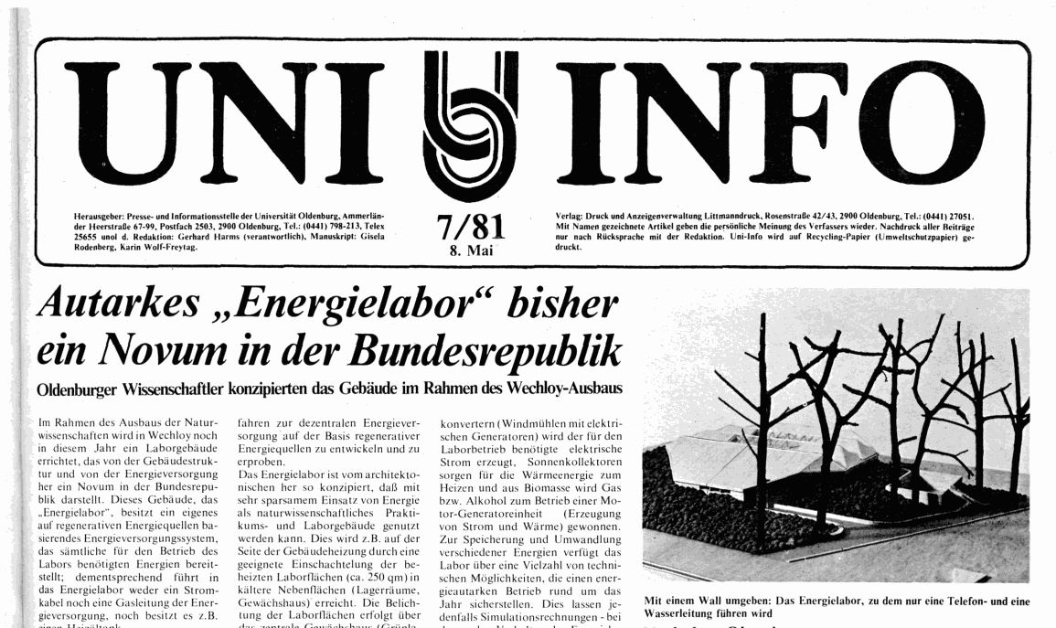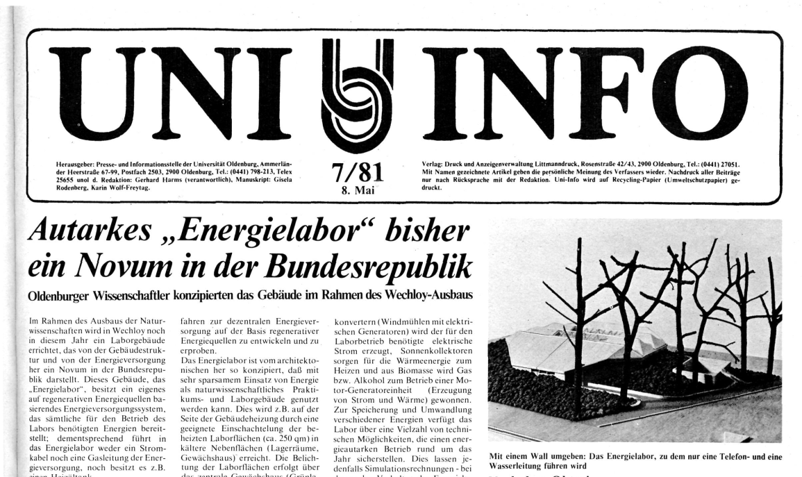Im Mai 1981 kündigte das „UNI-INFO“ der Universität Oldenburg den Bau des Energielabors auf dem naturwissenschaftlichen Campus im Stadtteil Wechloy an. Es galt mit seinem autarken Energieversorgungssystem – ohne Anschluss an das Strom- und Gasnetz – seinerzeit als „Novum in der Bundesrepublik“.
