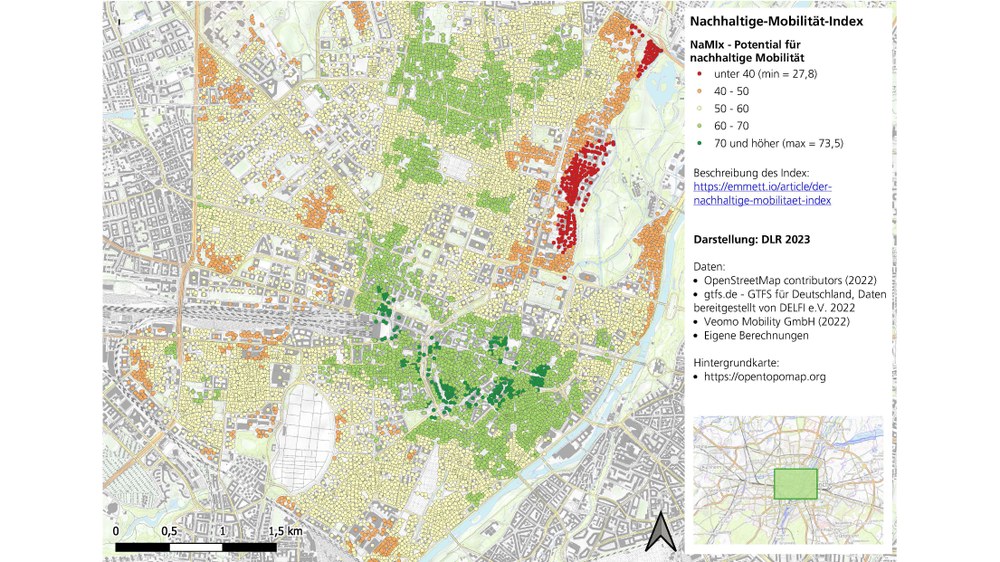 Das Projekt NaMIx (" Nachhaltige-Mobilität-Index ") wurde erfolgreich abgeschlossen. Hauptziel von NaMIx war es, eine Grundlage für die Bewertung von Standorten und Quartieren hinsichtlich nachhaltiger Mobilität zu schaffen. Das Team hat einen Ansatz entwickelt, um relevante Daten zur nachhaltigen Mobilität zu sammeln und die verschiedenen Indikatoren (wie z.B. Fahrradfreundlichkeit, Fahrzeit ins Stadtzentrum, Verfügbarkeit von Supermärkten) zu vereinheitlichen und vergleichbar zu machen. Das Ergebnis ist ein wissenschaftlich fundierter Index, der das Potenzial für nachhaltige Mobilität an einem Standort in einer einzigen Zahl ausdrückt.