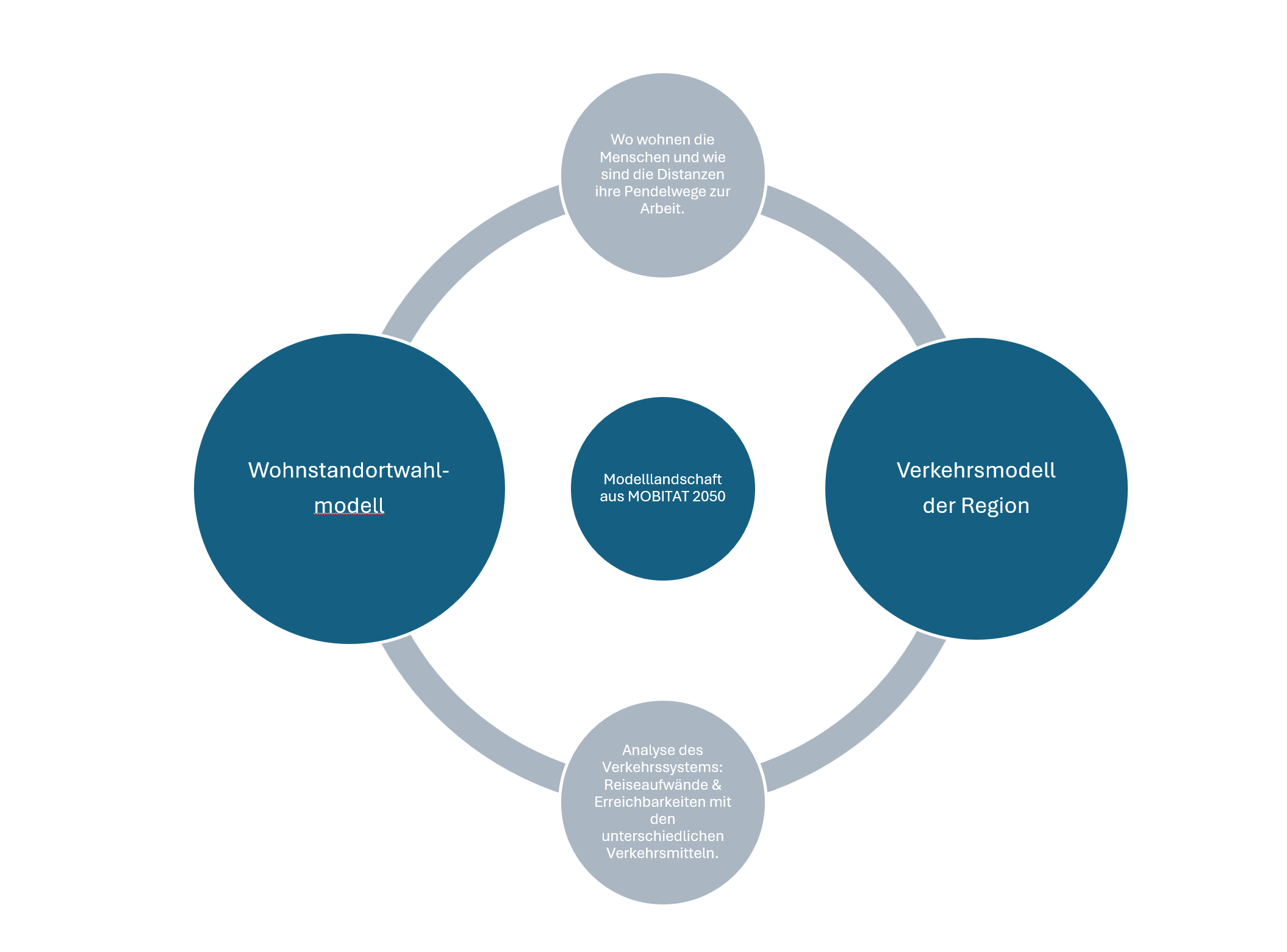 Die Überprüfung zur Wirksamkeit von verschiedenen Maßnahmen der Verkehrsplanung ist ein wichtiger Bestandteil der Forschungsarbeit. Das Projektteam in MOBITAT hat Wohn- und Arbeitsplatzstandorte und deren Verbindung mit dem Verkehrssystem in einer Modellandschaft zusammengeführt. Zusammen können die Modelle nun prognostizieren, wie sich die Bevölkerung in der Region entwickeln wird, verteilt sie anschließend auf Haushalte und Gemeinden und bildet ab, welchen Effekt unterschiedliche Maßnahmen auf Verkehr, Wohnen und Arbeiten haben.