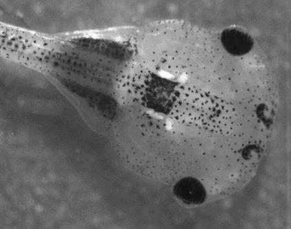Körper einer Kaulquappe. Die Sensoren des Gleichgewichtsinns sind die hell scheinenden Strukturen in der Bildmitte (augennahe und seitlich vom Rückenmark wegstrebend die Otokonien des Utrikulus, der für die Auslösung des VORs verantwortliche Sensor).