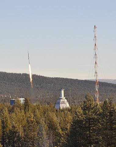 3 – 2 – 1 – 0: Mapheus-2 hebt vom Raketenstartplatz Esrange bei Kiruna in Nordschweden ab. In der Startphase traten in der Rakete starke Beschleunigungskräfte auf, nach dem Ausbrennen der beiden Raketenstufen profitierten die DLR-Wissenschaftler dann drei Minuten lang von Schwerelosigkeitsverhältnissen. Die Nutzlast fällt im freien Fall zur Erde zurück und landete - abgebremst durch Fallschirme - sicher am Boden. Rechts im Bild zu sehen ist der Windturm, links daneben im Wald versteckt steht der Launcher, aus dem Mapheus-2 gestartet ist.
