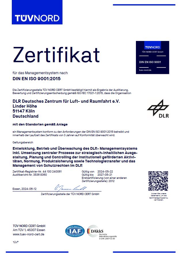 Vorschaubild: Zertifikat DLR-Managementsystem ISO 9001