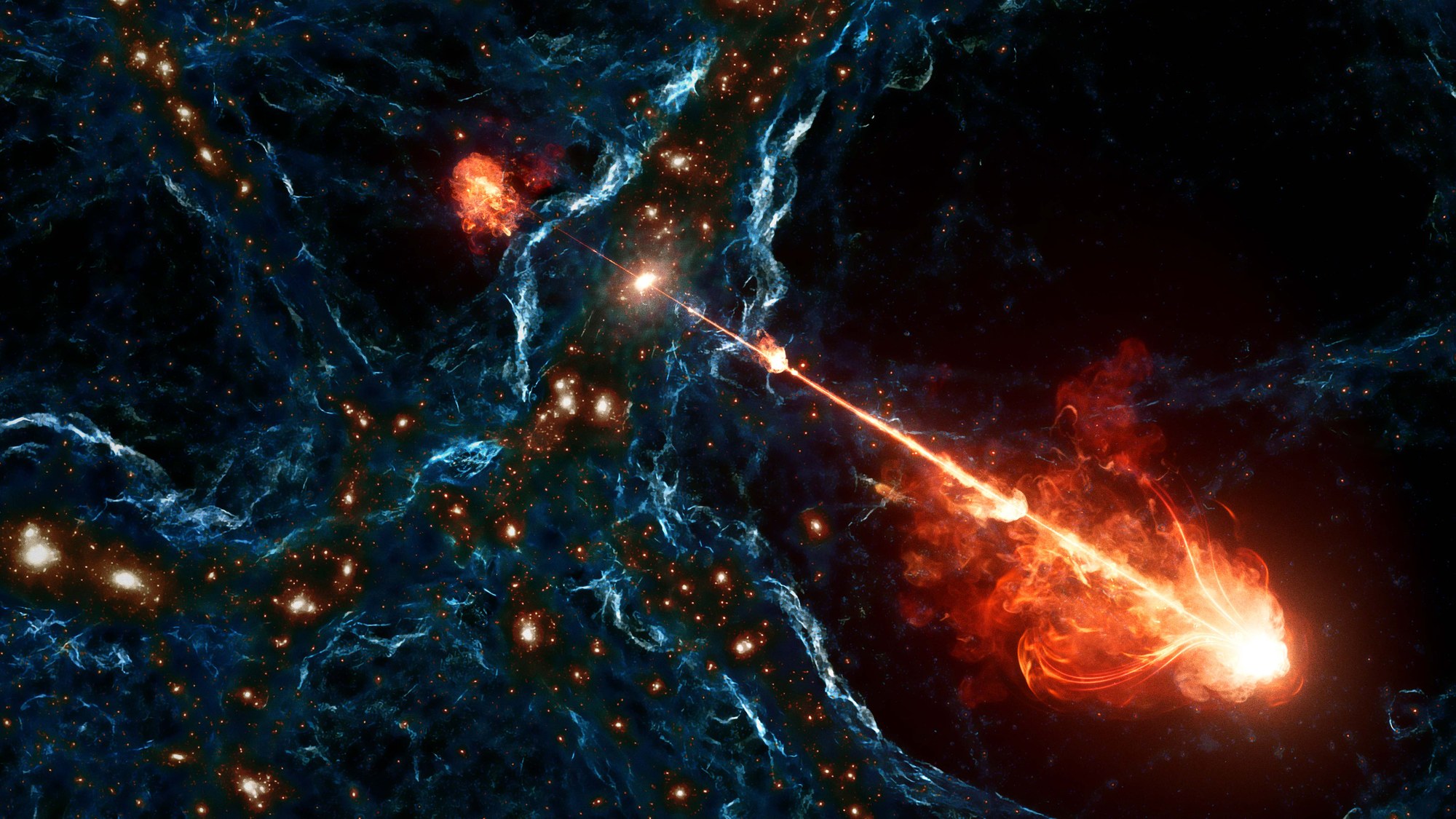 Künstlerische Darstellung des größten Plasmastrahls eines Schwarzen Lochs.