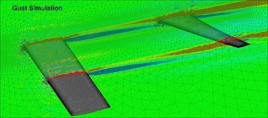 Computersimulation der Wirbel um ein Flügel- und ein Leitwerk-Modell, wie sie bei Windböen entstehen können. Rot sind stärkere Wirbel, blau solche mit umgekehrtem Drehsinn.