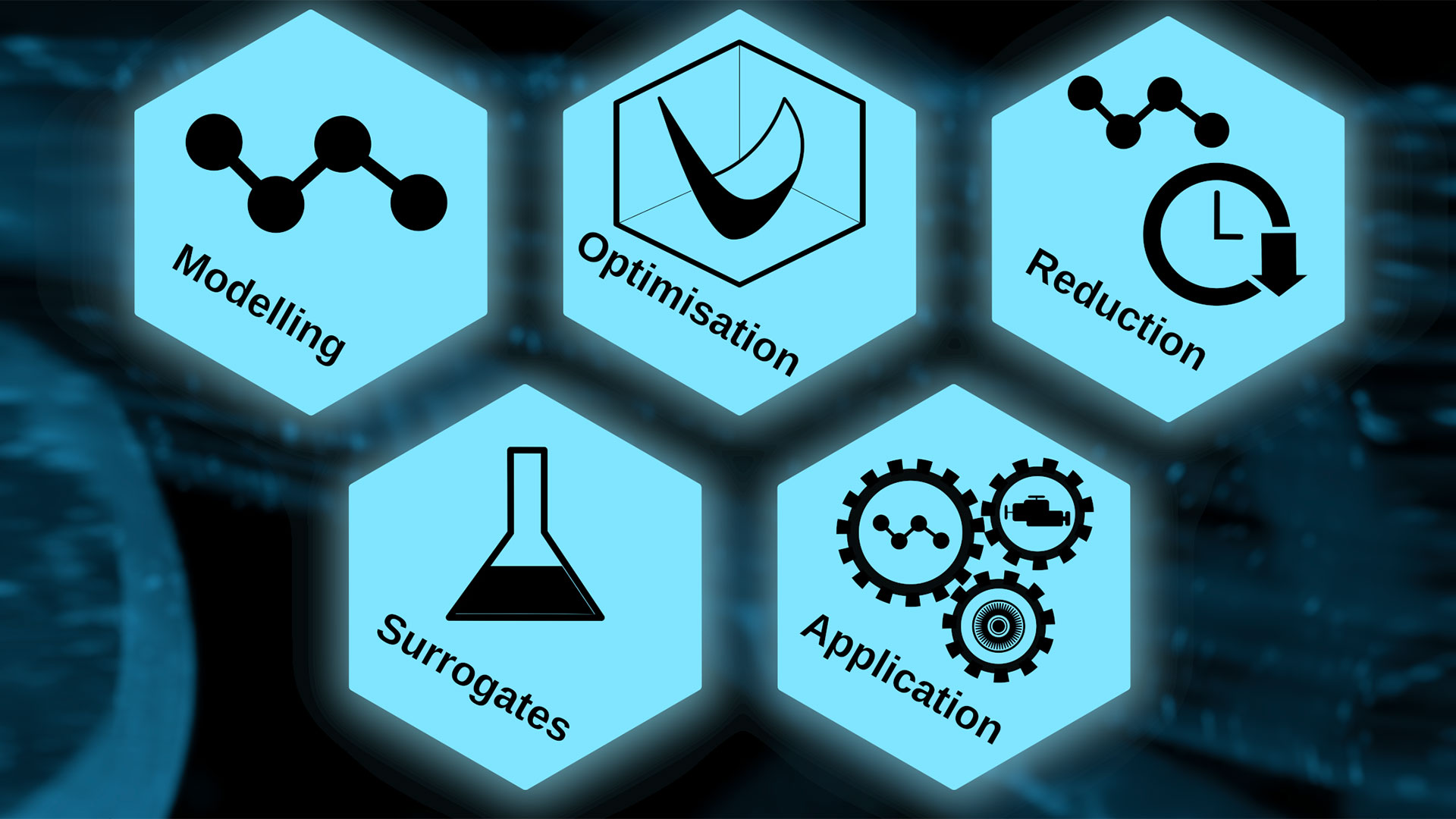 Zur Erhöhung der Genauigkeit chemisch-kinetischer Modelle werden fortschrittliche Optimierungsmethoden entwickelt und verwendet. Dabei verwendet die Abteilung die hauseigene, hoch effiziente Methode des linearen Transformationsmodells (linTM), welches die numerischen Kosten gegenüber konventionellen Methoden um Größenordnungen reduziert. Dies eröffnet neue Möglichkeiten, umfangreiche chemisch-kinetische Modelle mit umfassenden experimentellen Daten bei numerisch vertretbarem Aufwand zu optimieren.