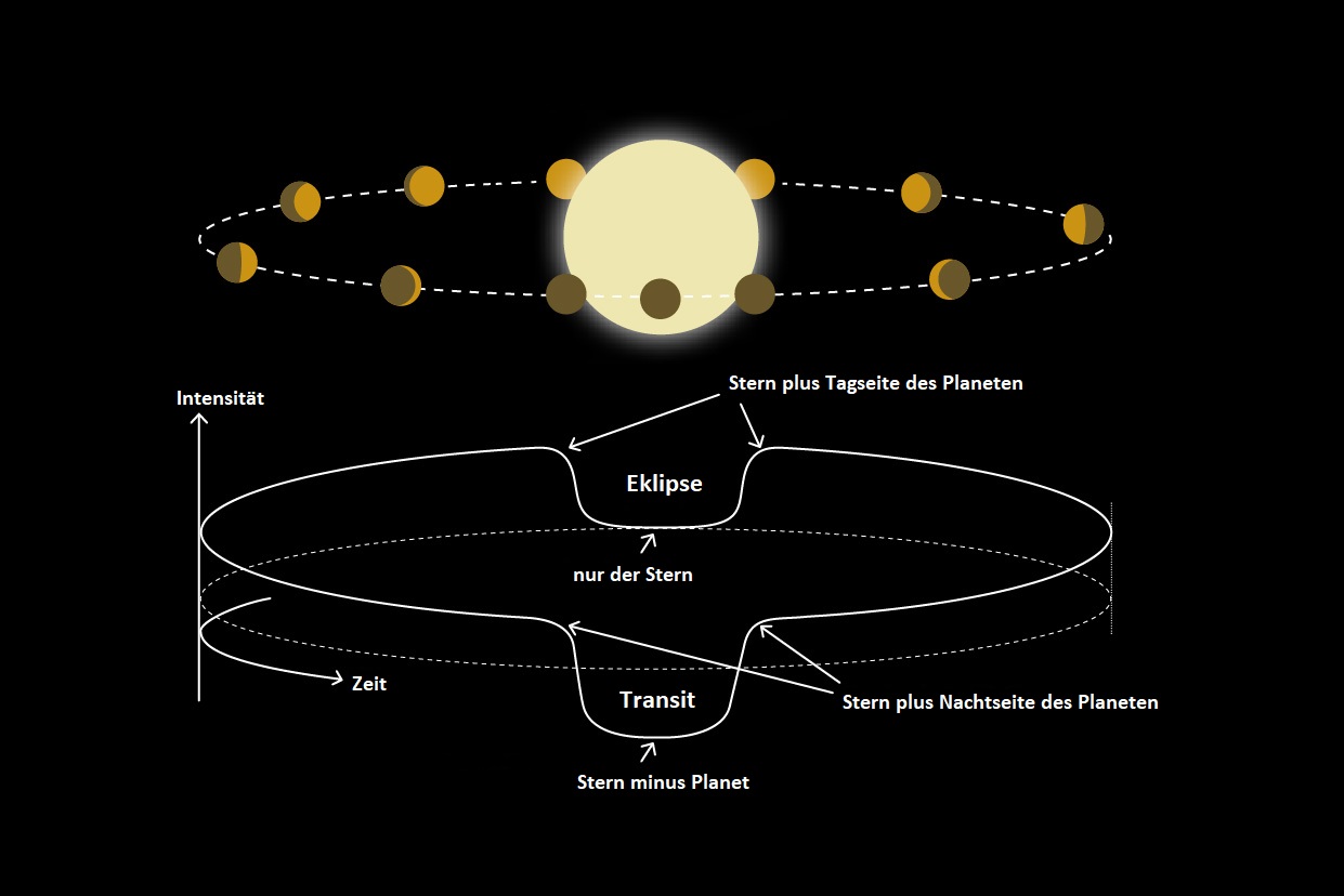 Während eines Umlaufs um den Stern, verändert sich die beleuchtete Planetenoberfläche für einen Betrachter. Kurz vor der Eklipse ist die vom Planeten reflektierte Strahlung am größten und erhöht die Intensität des gesamten Systems, die ein Teleskop nachweisen kann.