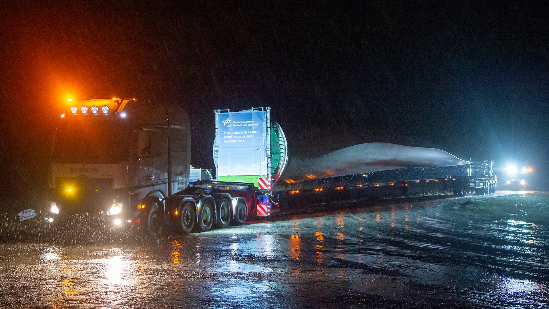 Transport der Rotorblätter für die Windenergieanlagen OPUS 1 und OPUS 2 auf dem DLR Forschungspark Windenergie WiValdi. Schwertransporter mit Beleuchtung im strömenden Regen.