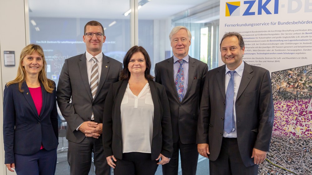 Ministerialdirektor Dr. Frehse (Abteilungsleiter Heimat) und Dr. Latsch (Referatsleiter Geoinformationswesen) vom Bundesministerium des Innern, für Bau und Heimat (BMI) besuchten am 1. Oktober 2019 das ZKI im Deutschen Fernerkundungsdatenzentrum (DFD), um sich über laufende Arbeiten sowie praktische Anwendungen der Forschungsarbeiten innerhalb der operationellen ZKI-Services zu informieren. Der aktuelle Stand der mit dem BMI vertraglich vereinbarten Unterstützung von Bundesbehörden und Einrichtungen des Katastrophenschutzes und der Sicherheitsbehörden interessierte Herrn Dr. Frehse besonders. Zudem wurde über den angelaufenen Prozess der Übertragung von Aufgaben aus dem Bereich der satellitengestützten Kriseninformation zum Bundesamt für Kartographie und Geodäsie (BKG) informiert.
