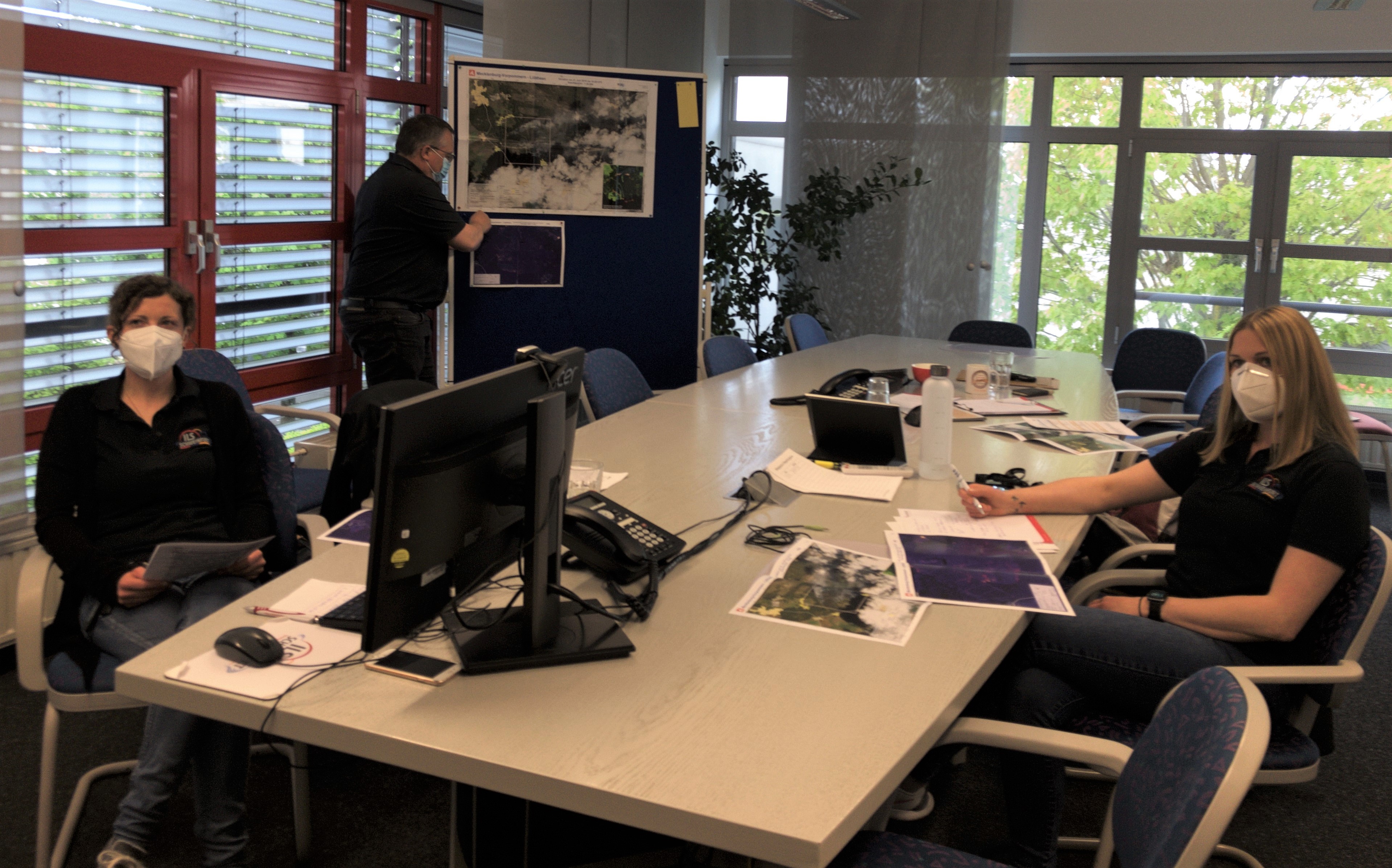 Am 17. Mai 2021 fand die gemeinsame Übung „Forest Fire 2021“ zwischen der Integrierten Leitstelle Schweinfurt des Bayerischen Roten Kreuz (BRK) und dem ZKI statt. Anhand verschiedener realer Einsatzszenarien aus dem Themenfeld „Waldbrand“ trainierten die Mitarbeiter der Integrierten BRK-Leitstelle in Schweinfurt die Einschätzung des Bedarfs an fernerkundungsbasierten Kriseninformationen und den anschließenden Aktivierungsablauf. Ein wesentliches Ziel der Übung war es, den praktischen Einsatz einer erarbeiteten Checkliste zum möglichen Einsatz von Erdbeobachtungsdaten sowie auch die entsprechenden Kommunikationsabläufe zu üben und zu optimieren. Besonderes Augenmerk galt zudem den - im Falle einer erfolgreichen Anfrage - übermittelten Kartenprodukten sowie auch den zu erwartenden technologischen Entwicklungen der kommenden Jahre.