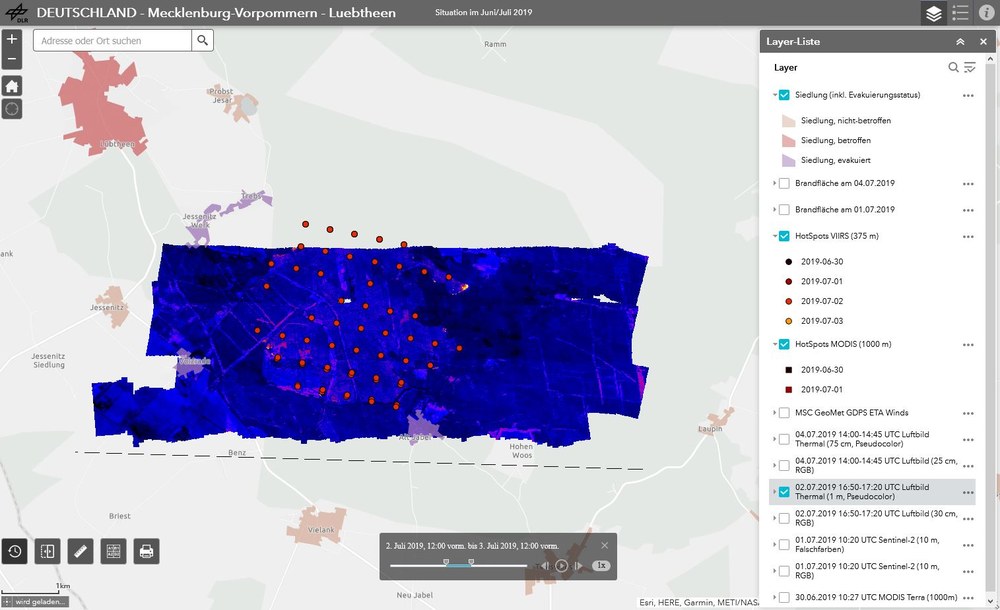 Derzeit arbeitet das ZKI über das DLR-interne Projekt „Optimierte Auswerteverfahren“, finanziert durch die Programmkoordination Sicherheitsforschung, u.a. an neuen, webbasierten (3D)-Darstellungen, um den Zugang zu relevanten Informationen zu verbessern. Digitale Plattformen bieten hier Potential, vielfältige Informationen (heterogene Daten, verschiedene Datenquellen) zusammenzuführen, wie im Beispiel unten für einen Waldbrand in der Umgebung von Lübtheen dargestellt. Der Nutzer wird durch erweiterte Interaktionsmöglichkeiten und neue Darstellungsformen bei seiner Aufgabe unterstützt, die Informationsvielfalt zu managen. Dies ermöglicht eine optimierte und datengetriebene Entscheidungsunterstützung.