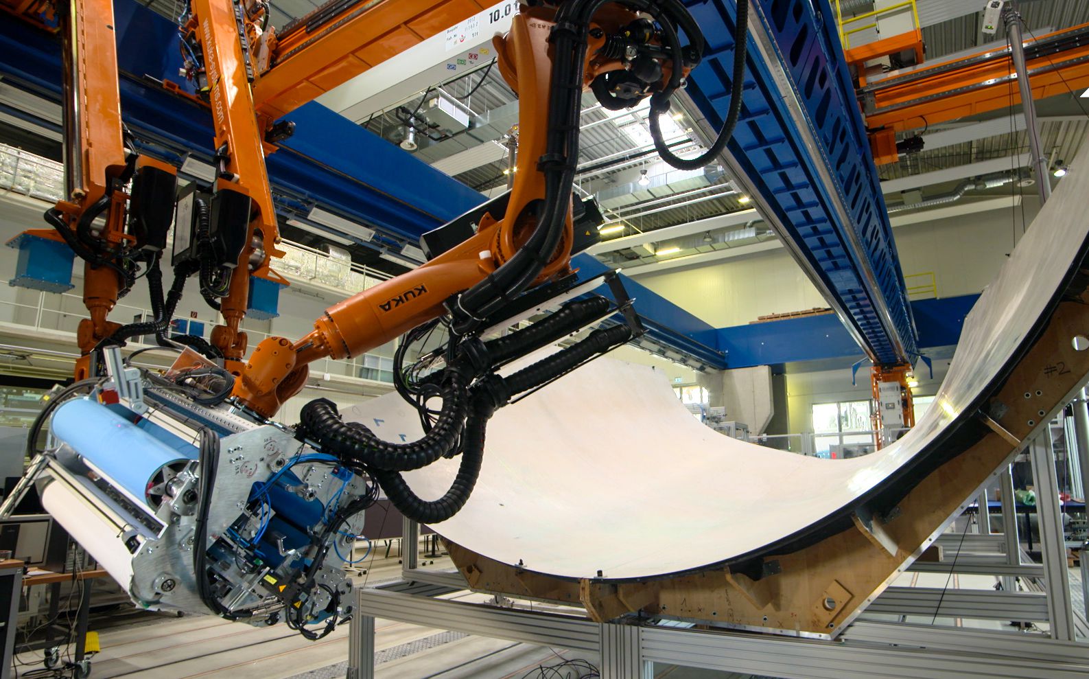 Rollende Ablage von breiten Prepreg-Tapes zur Applikation einer funktionalen Schicht zum Schutz eines CFK-Rumpfes vor Blitzschlag. Dargestellt ist die maßstabsgetreue, Demonstration des robotischen Prozesses zur Ablage auf einfach und doppelt gekrümmten Rumpfschalengeometrien.