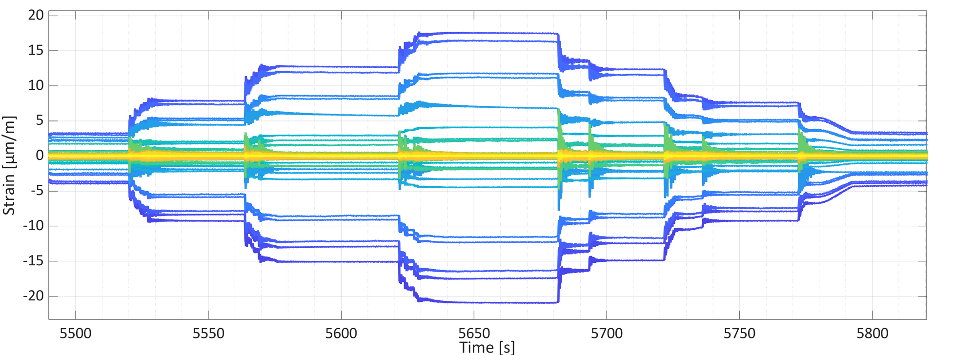 Time histories of the signals from all strain measurement points. The gradual application of the load can be recognized. During the rest phases of the individual steps, data points were marked from which the results of the calibration measurement are compiled.