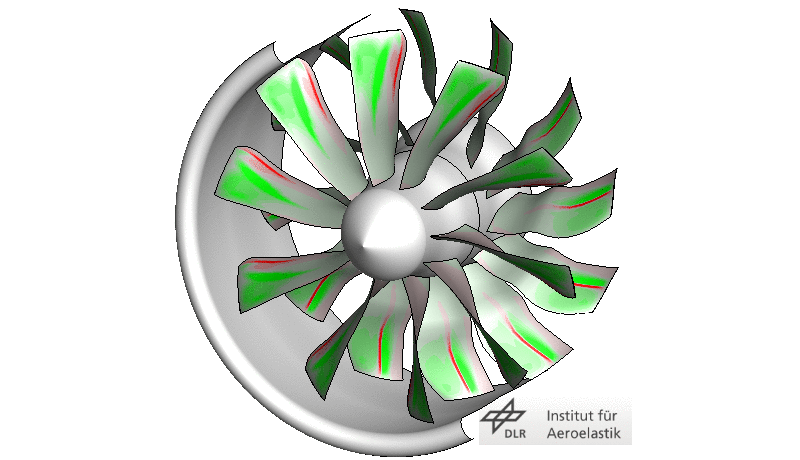 An engine blade does not vibrate on its own; the vibrations of the blades are coupled to each other. In addition to a coupling via their clamping points and the supporting disc, there is also a coupling via the aerodynamics. This coupling leads to a collective vibration pattern in which all blades vibrate synchronously with each other like a circulating wave, similar to a La-Ola wave in a stadium. This results in a phase shift between the neighboring blades performing the vibration, called the interblade phase angle (IBPA). This phase angle is an important parameter for analyzing the aeroelasticity of engine blades.