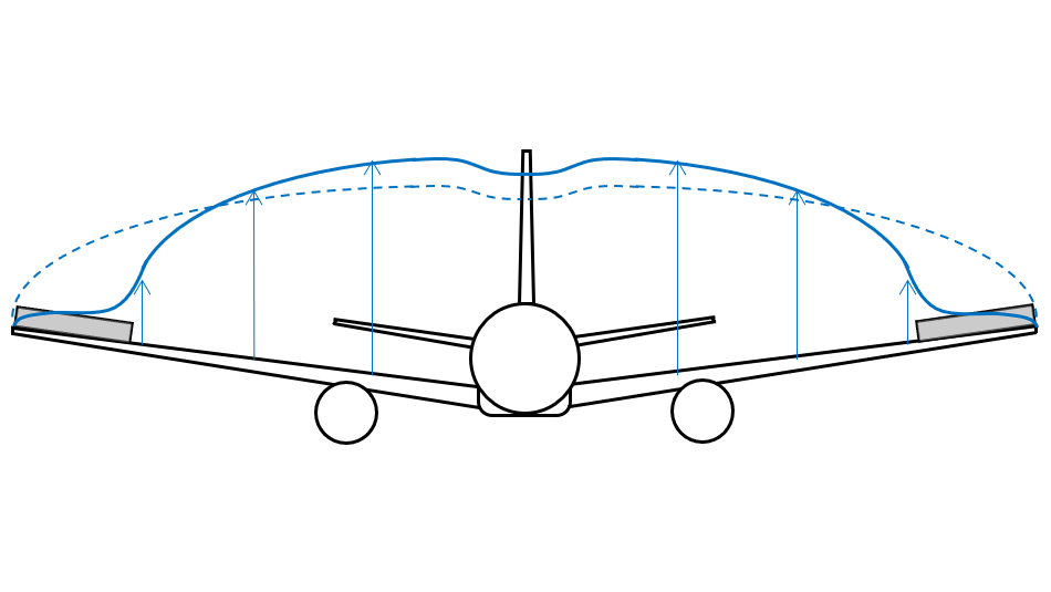 A similar principle is applied for turbulences. A sensor at the aircraft nose measures the angle of attack, and in case a gust or turbulence is detected, the flight control computer deflects the control surfaces dynamically to reduce the maximum wing loads, see Figure 3. This function is known as gust load alleviation (GLA).