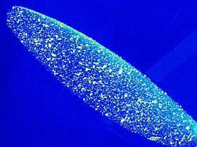 For deformation analysis areas on the test object which are suspected to suffer deformation are covered with a random dot pattern. By means of stereoscopic pattern correlation the deformation of the object surface relative to a reference surface can be measured with high accuracy. For this method being fully 3D it allows for the determination of the absolute surface shape of a test object. A random dot pattern applied to a model-propeller blade is shown in the image. The evaluation algorithm yields a quasi continuous sampling of the object shape. Its accuracy is estimated to be of the order of 0.01% (0.1mm per meter) of the field of view.