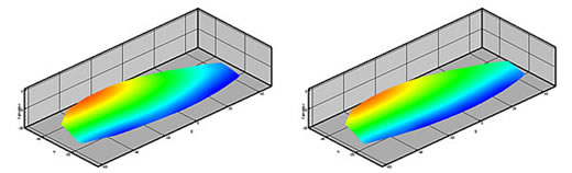 By comparison of the model shape in its reference condition and its deflected state the deformation of a model surface under e.g wind load is determined. A comparison of the propeller blade at different speeds of revolution is given in the image. The higher load (right drawing) yields a small deflection of the propeller tip.