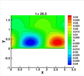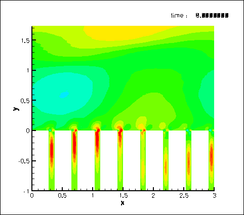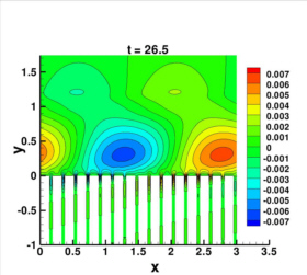 To illustrate the whole porous wall effect a movie of the boundary layer flow at Mach 6 over a porous wall with 8 pores is generated: The Mack modes are moving over the porous wall. The pores absorb a part of the disturbance energy and thus the growth of the modes can be reduced.