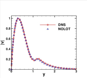 For these cases (smooth wall / porous wall with 16 pores) figure 3 shows the eigenfunction shape of the perturbation calculated with DNS in comparison with the stability code NOLOT. In both cases a good agreement is visible.