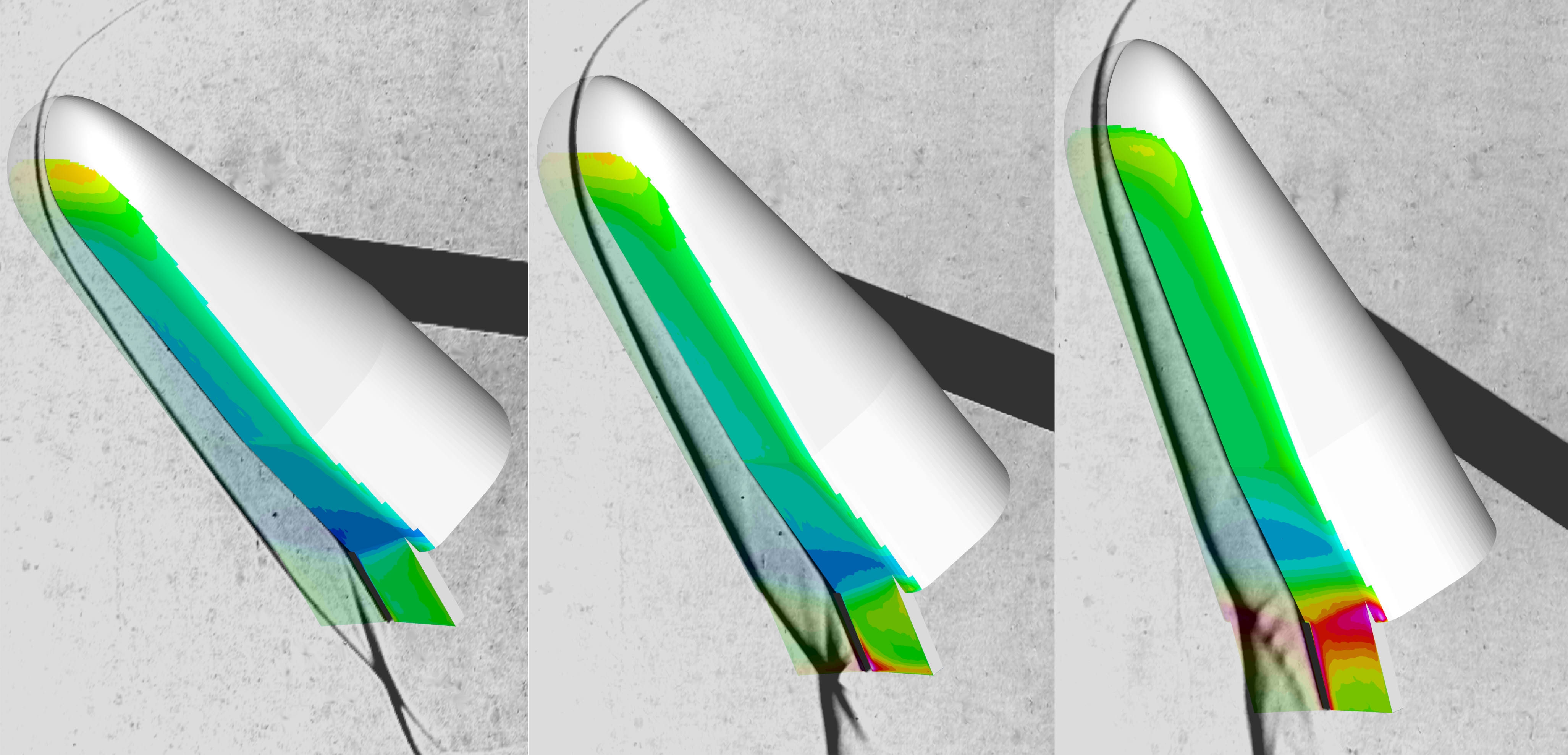 Streak pattern and heat flux distribution of the IXV configuration at different angles of attack during tests in the H2K