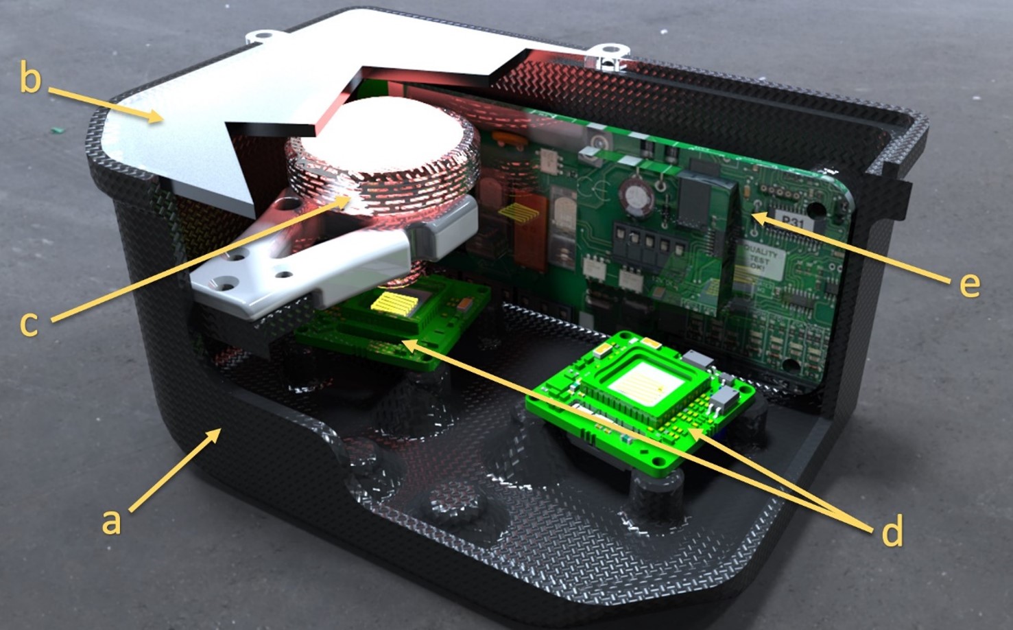 FLAPsense sensor unit enclosure design: a – composite enclosure (in broken view); b – viewing window (in broken view); c – optical lens (second one is not depicted); d – camera sensor boards; e – microprocessor boards and master controller)
