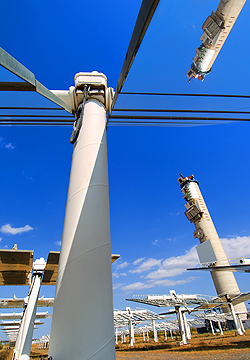 Installation of 80 Vestas V80 wind turbines off the Danish North Sea coast. Credit: Vestas Central Europe, Image at top and lower right: Solar tower power plant. Credit: DLR/ Markus-Steur.de