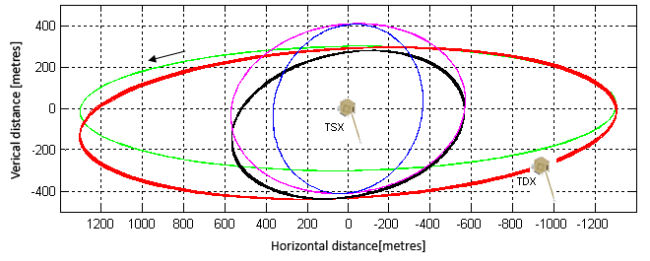 The change in the formation change, which was implemented within a period of three days, is shown in the diagram above: both satellites are flying away from the observer – into the image plane – and Earth's surface is 514 kilometres below them. Once per orbit around Earth, which takes about 95 minutes, TanDEM-X (TDX) moves in a counter-clockwise elliptical path relative to TerraSAR-X (TSX). The green ellipse shows the initial formation, which was used during the period of 22 July to 10 October. The third dimension – the separation of the satellites in the direction of flight – is not shown; this was 20 kilometres. As a result of the orbital manoeuvres performed by TanDEM X, the relative path changed first to the red ellipse, then to the black, the to the magenta, and finally to the blue curve. The horizontal separation was gradually reduced from 1305 to 362 metres and the vertical separation increased from 300 to 400 metres.