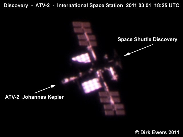 Captured from ground: ATV Johannes Kepler and Space Shuttle Discovery docked with the ISS