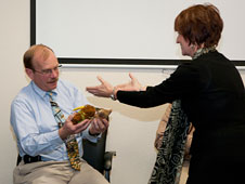 That item was among several that Dolci brought to the Dryden Aircraft Operations Facility in Palmdale, California, to present to SOFIA programme staff. Just after the crew briefing for the SOFIA's first dedicated science flight on 30 November 2010, Dolci presented SOFIA program manager Bob Meyer with the kiwi and koala. Meyer passed the items along to Nancy McKown of the Universities Space Research Association, mission manager for the first series of SOFIA's science flights, to be carried on board the airborne observatory. The mascots, Meyer said, "need to go flying."